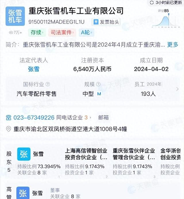 据公开数据显示,重庆张雪机车工业有限公司成立于2024年4月,法定代表人为张雪。2026年3月,公司注册资本由6000万元增至6540万元,当前实缴资本仅1200万元。